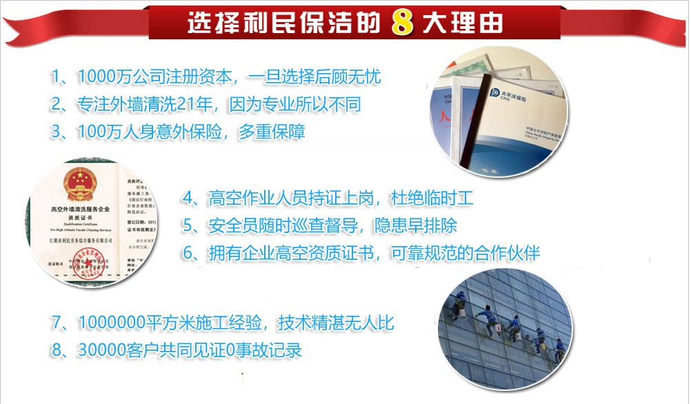 ![]() 利民,高空清潔行業(yè)的卓越領(lǐng)跑者。我們的外墻清洗業(yè)務(wù)包括:外墻清潔、外墻防水補(bǔ)漏、外墻涂料粉刷、LED樓體亮化工程高空安裝、外墻防水工程高空施工等系列高空作業(yè)項(xiàng)目,是物業(yè)公司、景觀工程公司、廣告公司、建筑、安裝公司、幕墻公司、各企事業(yè)單位等最佳高空作業(yè)服務(wù)專(zhuān)業(yè)供應(yīng)商.專(zhuān)業(yè)安全高效,承包高空外墻清洗,.專(zhuān)業(yè)的施工團(tuán)隊(duì),所有人員均持證上崗,高空人員均購(gòu)買(mǎi)100萬(wàn)保險(xiǎn),21年1000000平方的外墻清洗經(jīng)驗(yàn),優(yōu)質(zhì)的服務(wù)..[詳細(xì)] 經(jīng)典案例更多 >